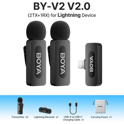 De zwarte BOYA BY-V2 V2 LIGHTNING 2TX + 1RX microfoon is speciaal ontworpen voor iPhone-gebruikers die op zoek zijn naar hoogwaardige audio-opnames. Met twee zenders en één ontvanger leg je eenvoudig gesprekken of interviews vast. De microfoon biedt drie niveaus van ruisonderdrukking, zodat je audio altijd helder en professioneel klinkt. De plug-and-play functionaliteit maakt het gebruik eenvoudig, en de zenders hebben een batterijduur tot 9 uur. Zo kan je meteen aan de slag en neem je langdurig op zonder onderbrekingen.