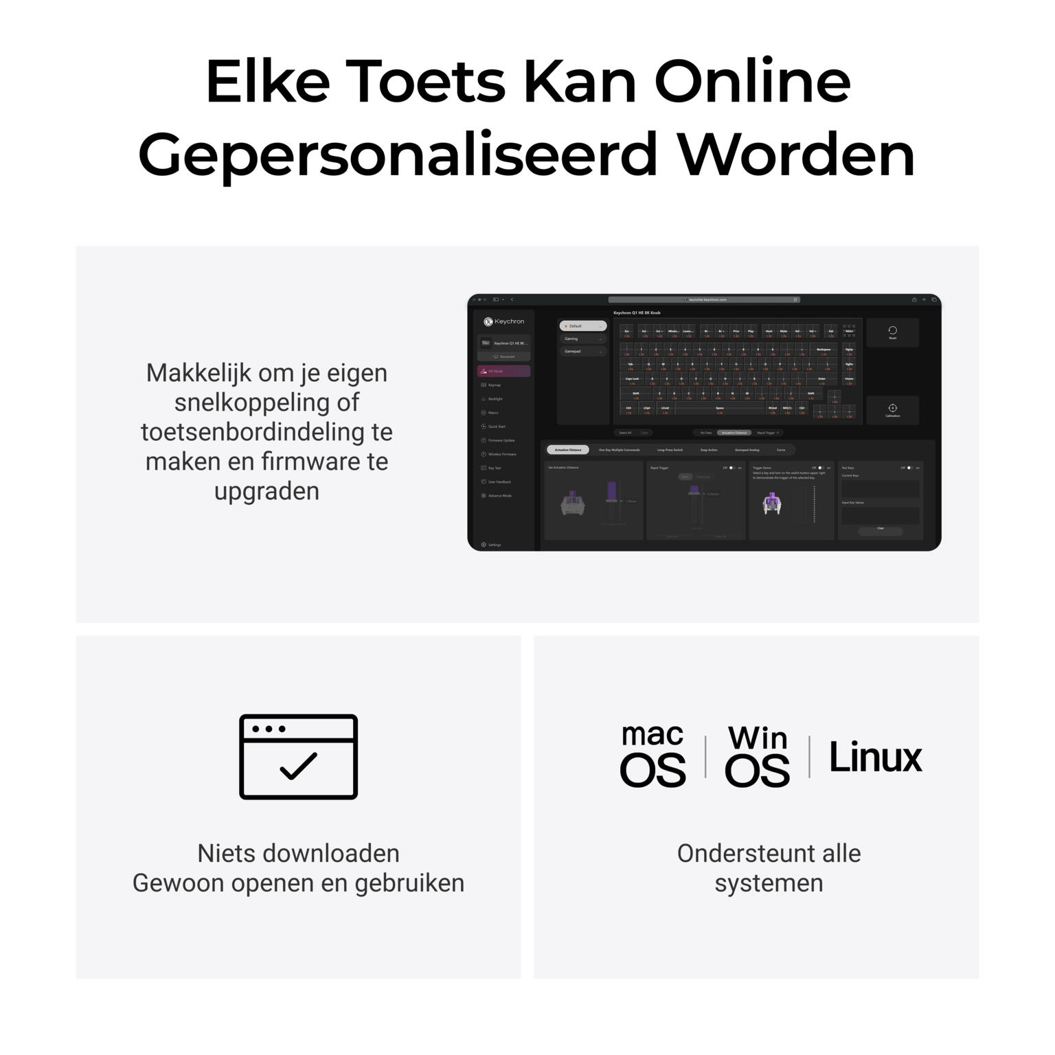 Met uitgebreide RGB-verlichting per toets en ondersteuning voor volledige key-customization is het toetsenbord eenvoudig naar wens in te stellen. Via de Keychron Launcher web-app pas je toetsfuncties, macro’s en activeringspunten aan voor een persoonlijke workflow of competitieve game-setup.
